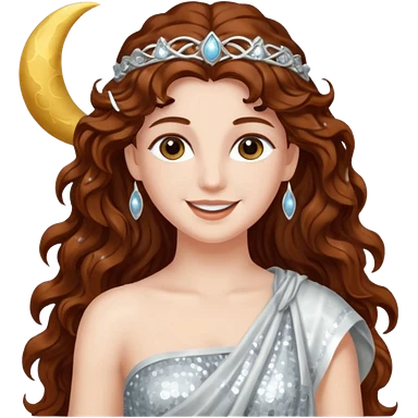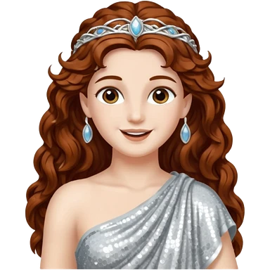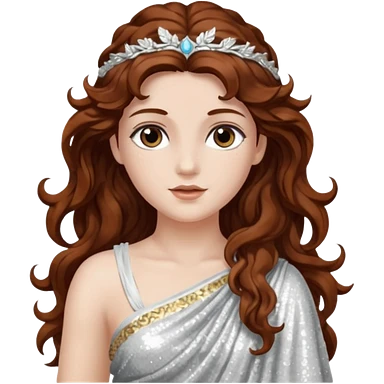 Diana, Goddess of Moon from Roman Deities with long dark auburn wavy hair, silver sequin toga emoji
