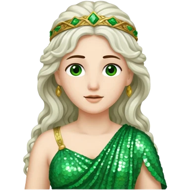 Juno, Goddess of Marriage from Roman Deities with long white brunette wavy hair, green sequin toga emoji