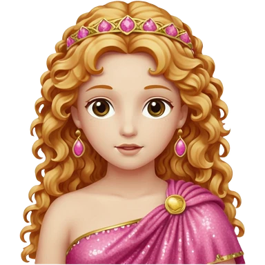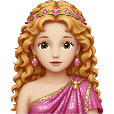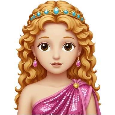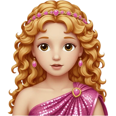 Venus, Goddess of Love from Roman Deities with long strawberry blonde wavy hair, pink sequin toga emoji