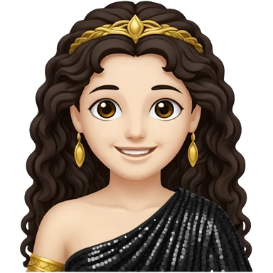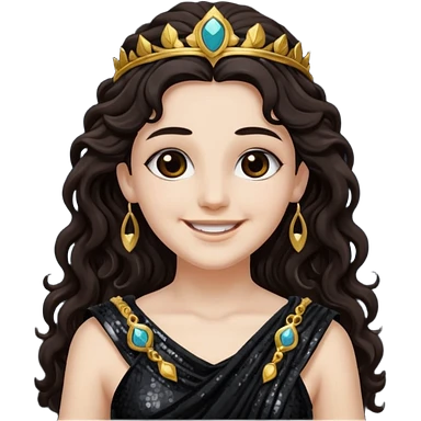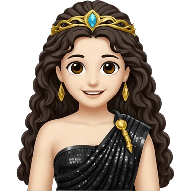Libera, Goddess of Death from Roman Deities with long dark brown wavy hair, black sequin toga emoji
