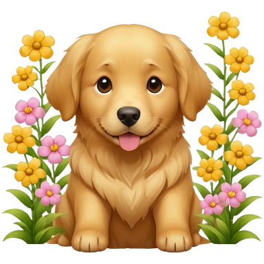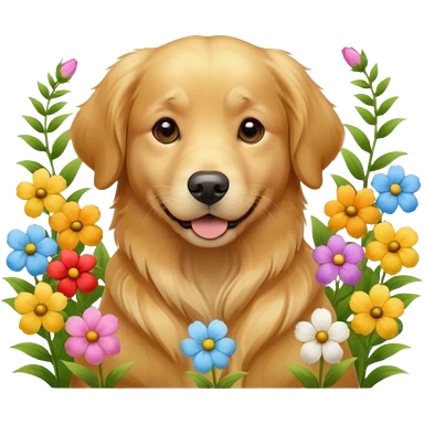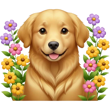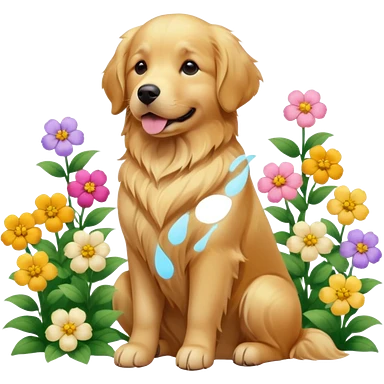 A Golden Retriever sitting in a blooming flower garden, sunlight highlighting its shiny golden fur. Gentle expression, realistic photography, warm color tones. emoji