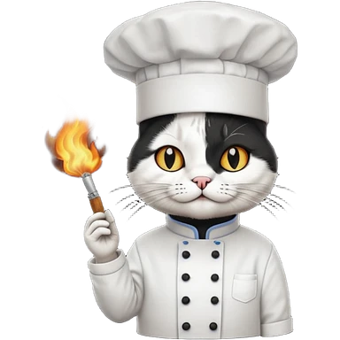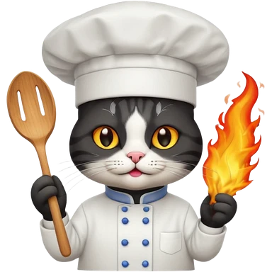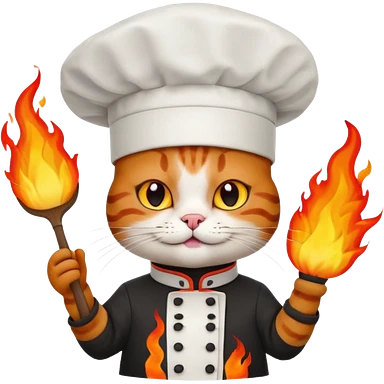 extra black chef cat wearing a tall white chef hat, burning hat emoji
