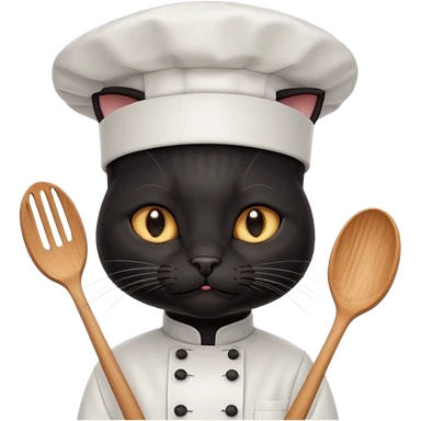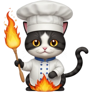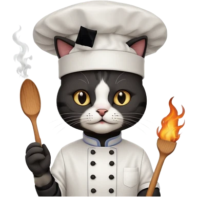 black chef cat wearing a tall white chef hat, burning hat emoji