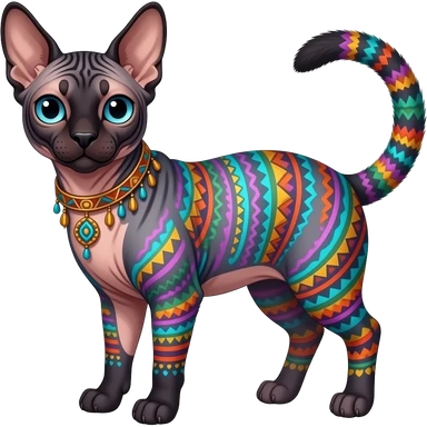 A Colorful exotic tropical tribal cute happy realistic esoteric patterned fluffy furry dark caracal-Lykoi-bobcat-sphynx-genet-civet-Fakémon-fursona-hybrid-fusion-animal-creature, full body, 4-legged emoji