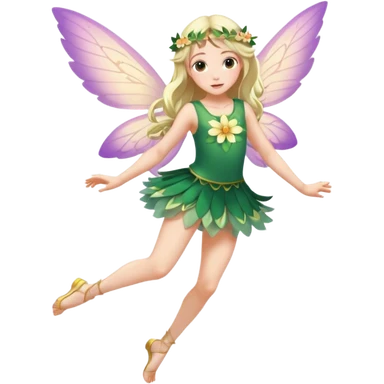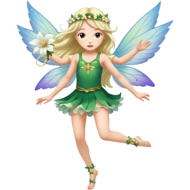 A flower fairy girl with long light pink hair, holding a magic stick, one leg straight and the other bent,flying, her whole body covered in fairy wings like Wendy's in Peter Pan. emoji