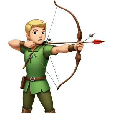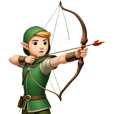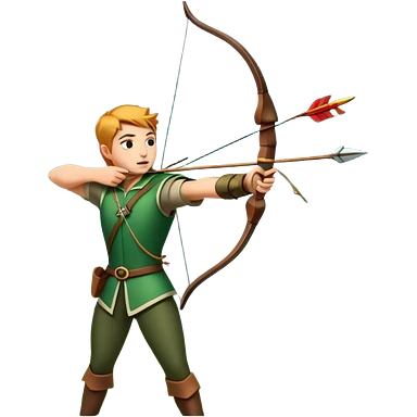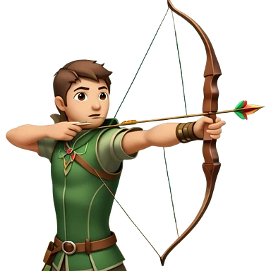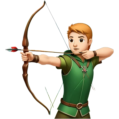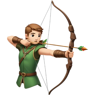 A skilled archer, resembling Robin Hood, drawing a bow and releasing an arrow towards a target. The scene captures the perfect moment of release, with the bowstring taut and the arrow flying toward the bullseye, set in a forest or archery range background. emoji