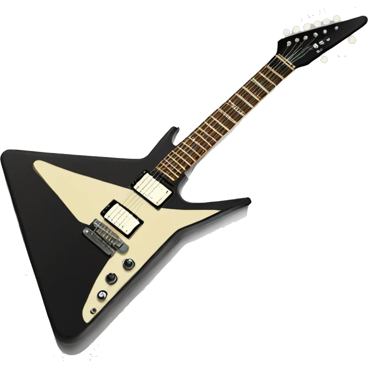 Create a bold and dynamic emoji representing the Epiphone Dave Mustaine Flying V Custom electric guitar. The design should feature the sharp, iconic V-shaped body of the guitar, with a custom finish reflecting Dave Mustaine’s signature style. Add intricate details like gold or chrome tuning pegs and pickups, with subtle graphics or patterns that reflect the aggressive, heavy metal aesthetic. Use a color palette of black, gold, and red, with a touch of metallic sheen for the high-end finish. The background should be transparent to emphasize the guitar's iconic shape emoji