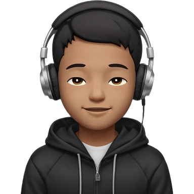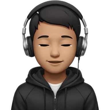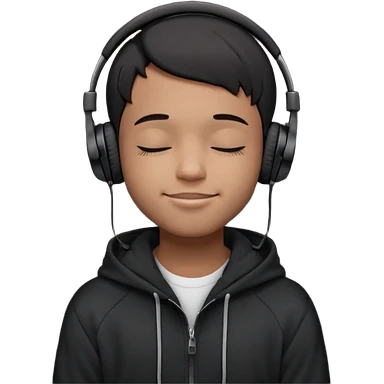 Young Black male, short hair, eyes closed, soft cheeky smile, calm and proud vibe. Dark hoodie, big black over-ear headphones. Focus on face and expression; exaggerate smile and eyes for small emoji size. Background optional. emoji