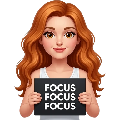 sexy girl with long wavy ginger hair and ginger eyes wearing a white tanktop is holding a black colored sign with FOCUS FOCUS FOCUS written on it emoji