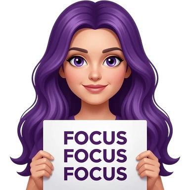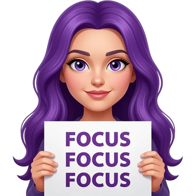 sexy girl with long purple hair and purple eyes holding a FOCUS FOCUS FOCUS sign emoji