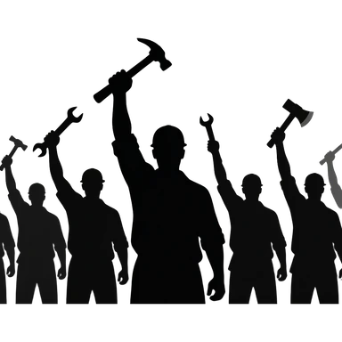Powerful graphic illustration of a general strike, massive crowd of industrial workers with raised tools, high contrast silhouettes, bold artistic style, dramatic shadows, focus on collective strength. emoji
