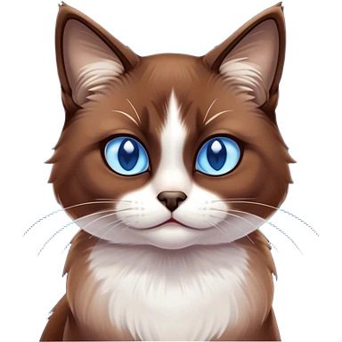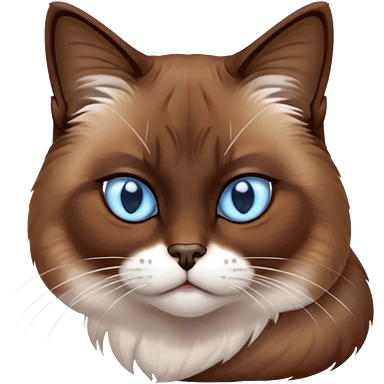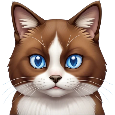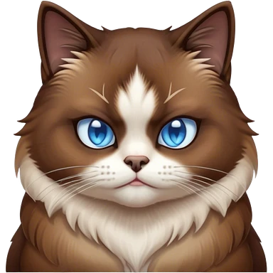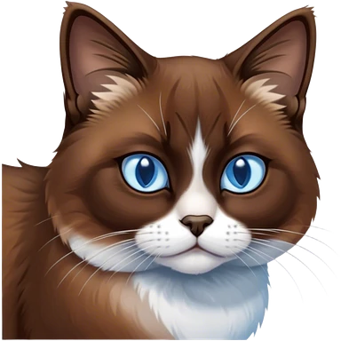 Cinematic Grumpy Brown Mantle Snowshoe Cat Portrait Emoji, Head tilted slightly with a deeply unimpressed expression, rich brown fur blanketing its back, contrasted by its signature white paws, chest, and face, piercing icy-blue eyes narrowed into an unamused glare, Simplified yet comically expressive features, highly detailed, glowing with a dry, sarcastic glow, high shine, effortlessly judgmental yet dignified, stylized with a touch of cynicism, bright but brooding, soft glowing outline, capturing the essence of an eternally unimpressed yet endearing feline, so lifelike it feels like it could sigh heavily at you in disdain at any moment! emoji