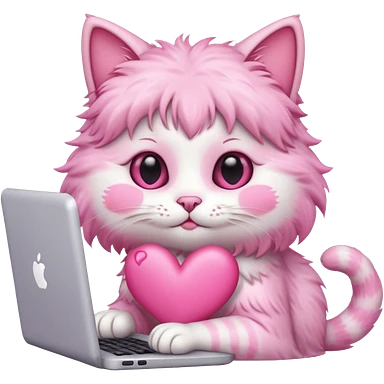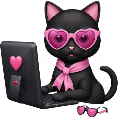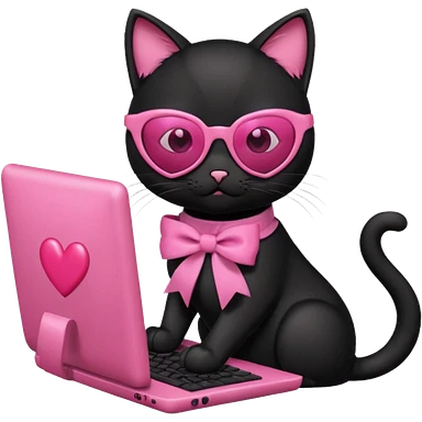 Black cat with pink ribbon and sunglasses doing pink computer with pink heart emoji