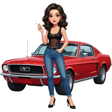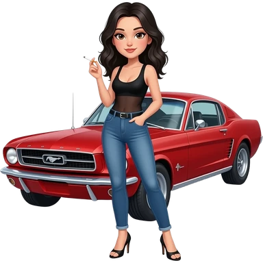 Pale girl with black wavy hair in front of a red Ford Mustang 1968 coupe. Girl wearing a sheer black sleeveless top with a medium neckline, jeans and heels with visible toes. Left hand on the hood and right hand on her waist. emoji