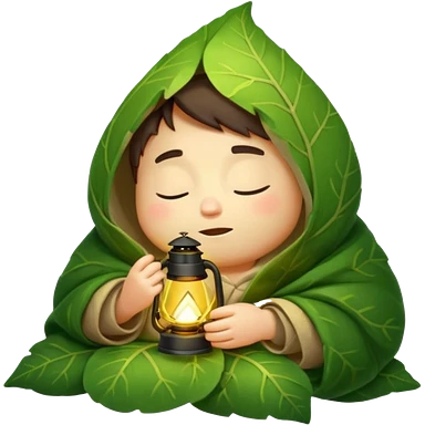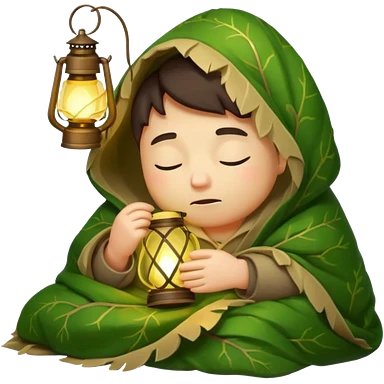 sleepy forest character wrapped in leaf blanket holding glowing lantern half asleep emoji