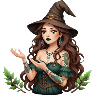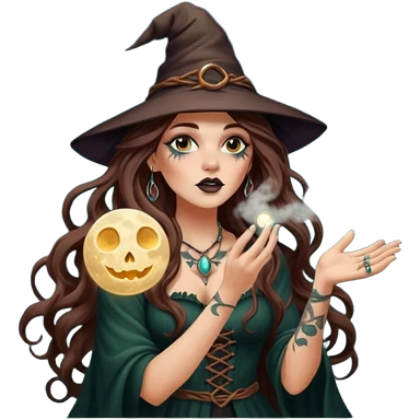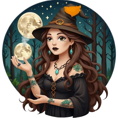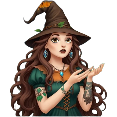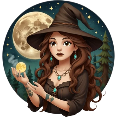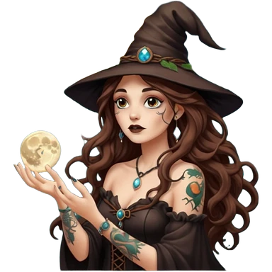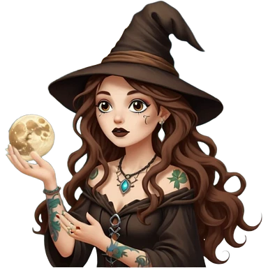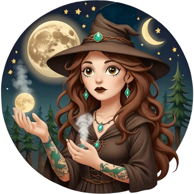 forest witch woman long wavy brown hair tattoos blowing moon dust emoji