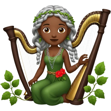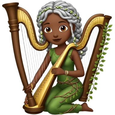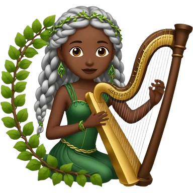 forest emoji character, dark skin woman with silver braids playing harp made of vines emoji