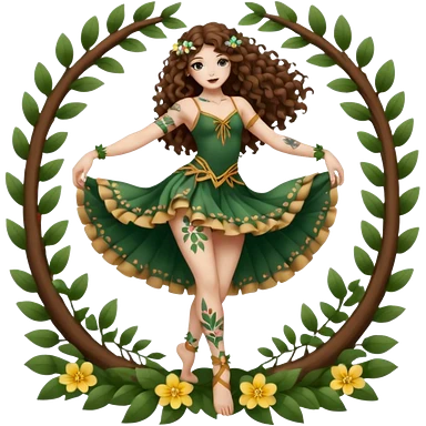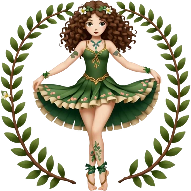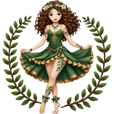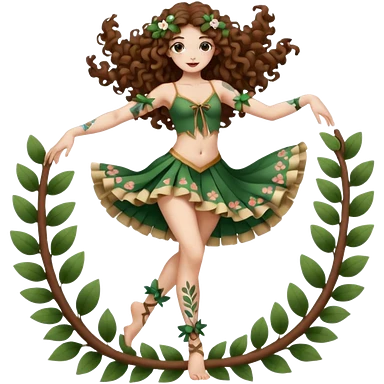 full body woman long curly brown hair brown eyes white skin tattoos forest nymph dancer pose, petal ribbons around legs emoji