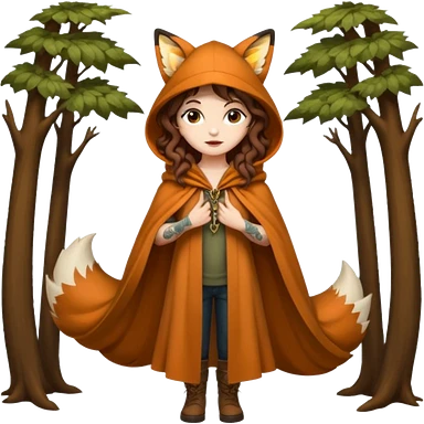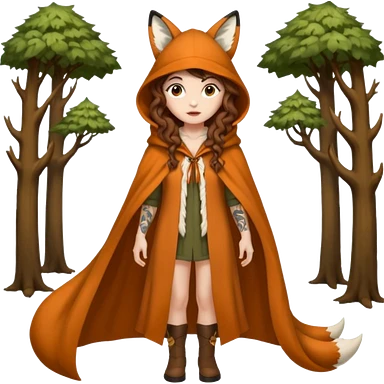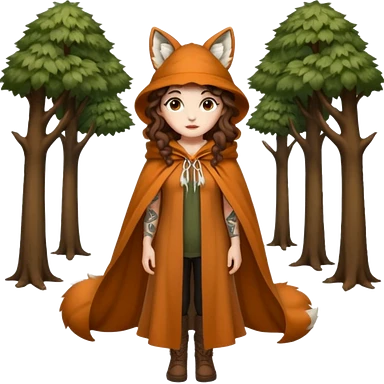 full body woman long curly brown hair brown eyes white skin tattoos wearing fox ear hat and open forest cloak, confident stance emoji
