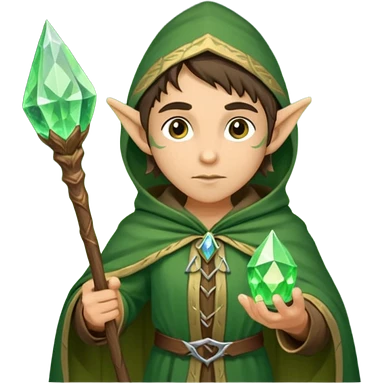 { "type": "human", "look": "forest elf mage, green cloak, wooden staff, glowing crystal tip", "description": "a forest elf mage in green cloak holding a wooden staff with a glowing crystal tip" } emoji