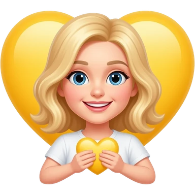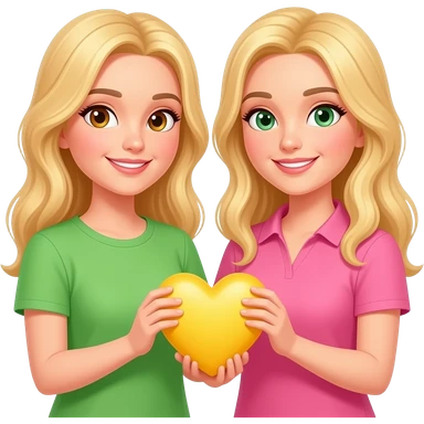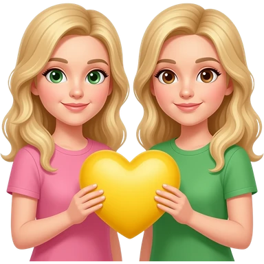 Foto de 2 rubias cogiendo un corazon amarillo con las manos la de la izquierda con una camiseta rosa y la otra con una camiseta verde con los ojos marrones la de la derecha y la de la izquierda color marrones y verdes emoji | AI Emoji Generator