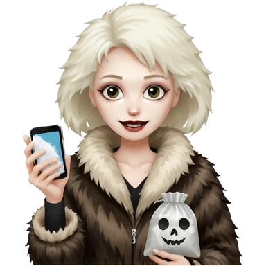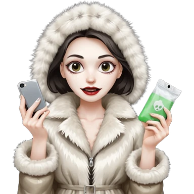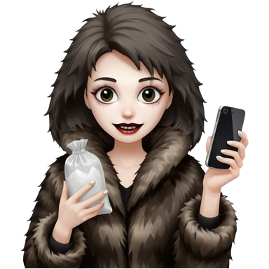 she is wearing a fur coat and has a transparent tiny, small plastic bag full of white powder, and her phone in the other hand, she has lost so much weight, she looks evil , she has an evil grin emoji