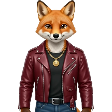 Fox in burgundy leather biker Jacket, waist size, jewelleries emoji
