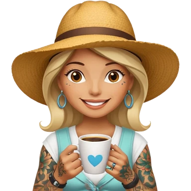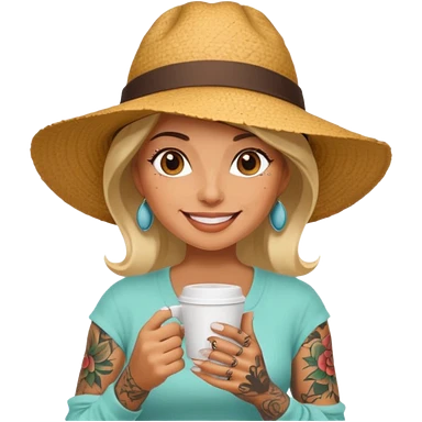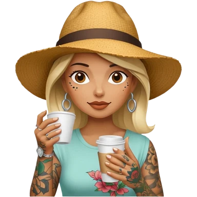 Tattooed lady in sunhat holding coffee cup emoji