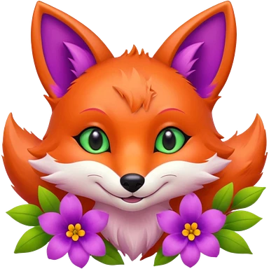 Smiling Pink Fox with green eyes and orange and purple flowers emoji