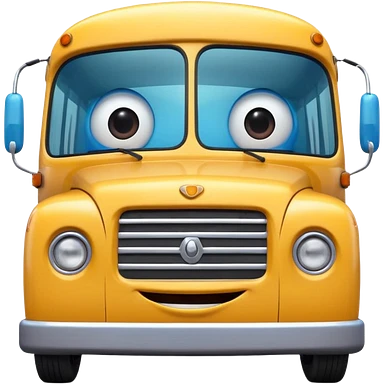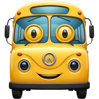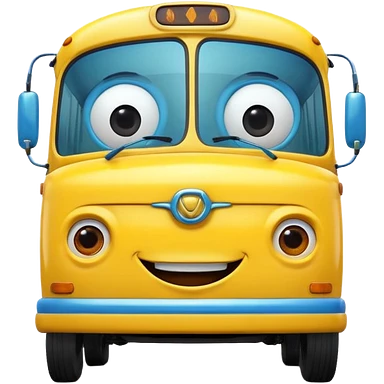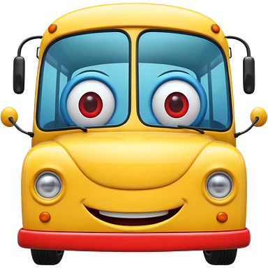 Front view of a bus with a cheerful smiling face, expressive eyes integrated into the windshield, glossy 3D animation style, Pixar-inspired, vibrant colors, soft shadows, cinematic lighting, ultra detailed, 4k render emoji