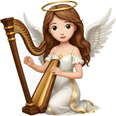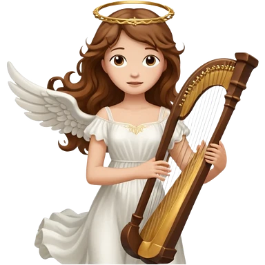 Female angel holding harp with flowing brown hair emoji