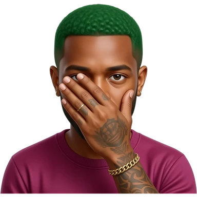 frank ocean, no shirt, green hair buzz cut, hand covering face emoji