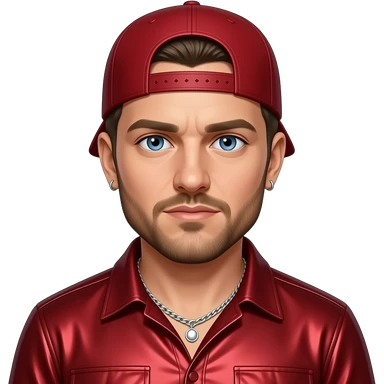 Fred Durst with blue eyes, dark blonde short hair, red cap, red metallic shirt, silver necklace and short earrings emoji