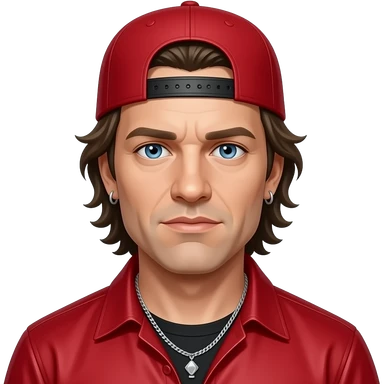 Fred Durst with blue eyes, dark blonde hair, red cap, red metallic shirt, silver necklace and short earrings emoji