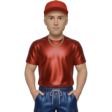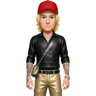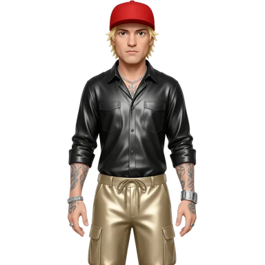 Fred Durst with blonde hair, red cap, black metallic shirt, beige metallic baggy pants, silver necklace emoji