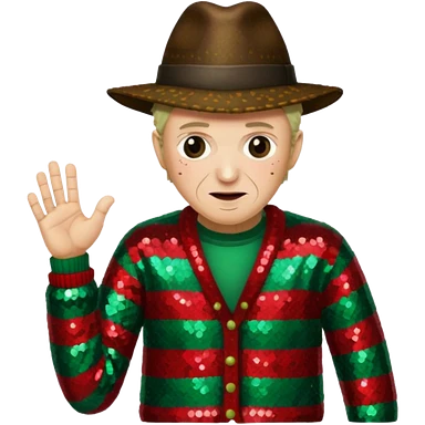Freddy Krueger with red and green stripe sequin sweater, dark brown sequin jacket and hat emoji
