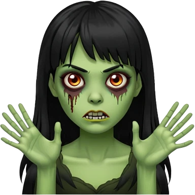 mulher zombie verde com cabelos pretos longos e franja com as mãos para frente igual um zombie emoji