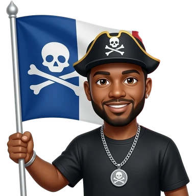 french rapper booba very ressemblant with real bald head and no opaque beard et angry eyebrows et unkut teeshirt holding the pirate flag emoji