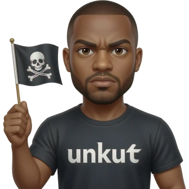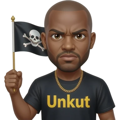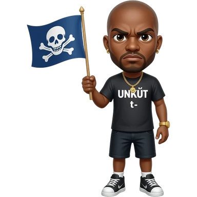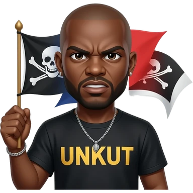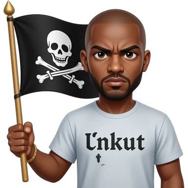 french rapper booba with bald head et angry eyebrows et unkut teeshirt holding the pirate flag emoji