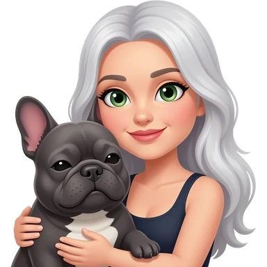 White woman with long white gray hair and green eyes cuddling plump gray french bulldog emoji