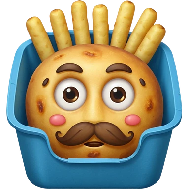 fried potatoes with eyes and mustache, in a blue carton emoji