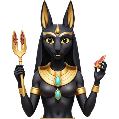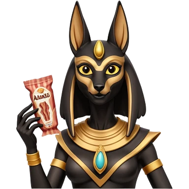 Friendly silky Black fur beautiful female anubis statue posed biting on store-brand bacon Usda-certified godly packaging emoji | AI Emoji Generator