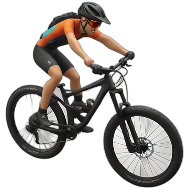 A thrilling downhill mountain biking scene! A rider in full gear speeds down a steep rocky trail, kicking up dust. The rugged mountain landscape surrounds them, with towering peaks, evergreen trees, and a bright blue sky. The rush of adventure is in the air. Transparent background. emoji