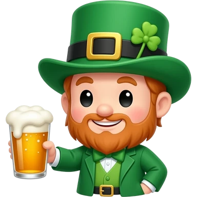 McCarthy's Irish Pub: 3D emoji style, glossy surface, soft shadows, white background, centered, no text, cute leprechaun character, tiny hat, holding a pint glass, cheeky grin, bright green, no defined gender emoji