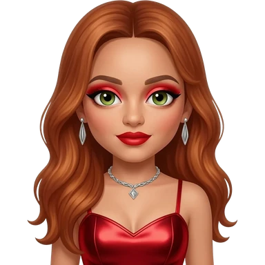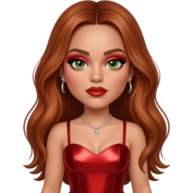 from Little Mix with hazel-green eyes, long copper hair, red eyeshadow and lipstick, red metallic sweetheart dress, silver necklace with earrings emoji