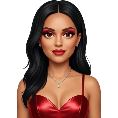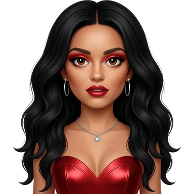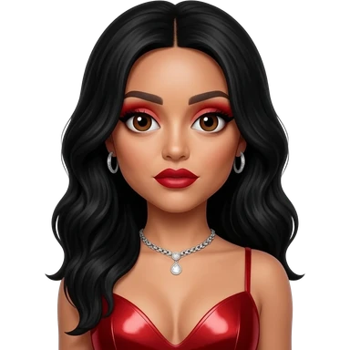 Leigh-Anne Pinnock from Little Mix with dark brown eyes, long black wavy hair, red eyeshadow and lipstick, red metallic sweetheart dress, silver necklace with earrings emoji