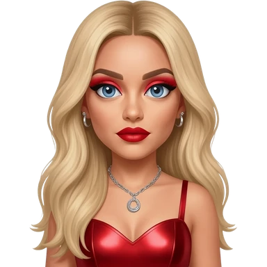 Perrie Edwards from Little Mix with blue eyes, long blonde hair, red eyeshadow and lipstick, red metallic sweetheart dress, silver necklace with earrings emoji