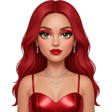 from Little Mix with hazel eyes, long red hair, red eyeshadow and lipstick, red metallic sweetheart dress, silver necklace with earrings emoji | AI Emoji Generator