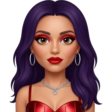 Jade Thirlwall from Little Mix with brown eyes, long dark purple hair, red eyeshadow and lipstick, red metallic sweetheart dress, silver necklace with earrings emoji