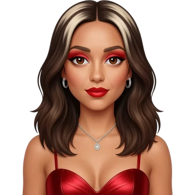 Jade Thirlwall from Little Mix with brown eyes, long dark brown hair with white blonde highlights, red eyeshadow and lipstick, red metallic sweetheart dress, silver necklace with earrings emoji